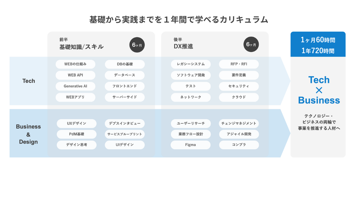 ITの基礎的な能力はもちろんのこと、既存事業のDXに必要な知識・スキル、新規事業創出の際、アイディアを形にするモックアップ(簡易アプリ)の作成・ブラッシュアップスキル、データ分析スキル、業務自動化スキル等、プログラミングに留まらず、ビジネスパーソンがDX時代に求められるスキルを広く習得可能です。