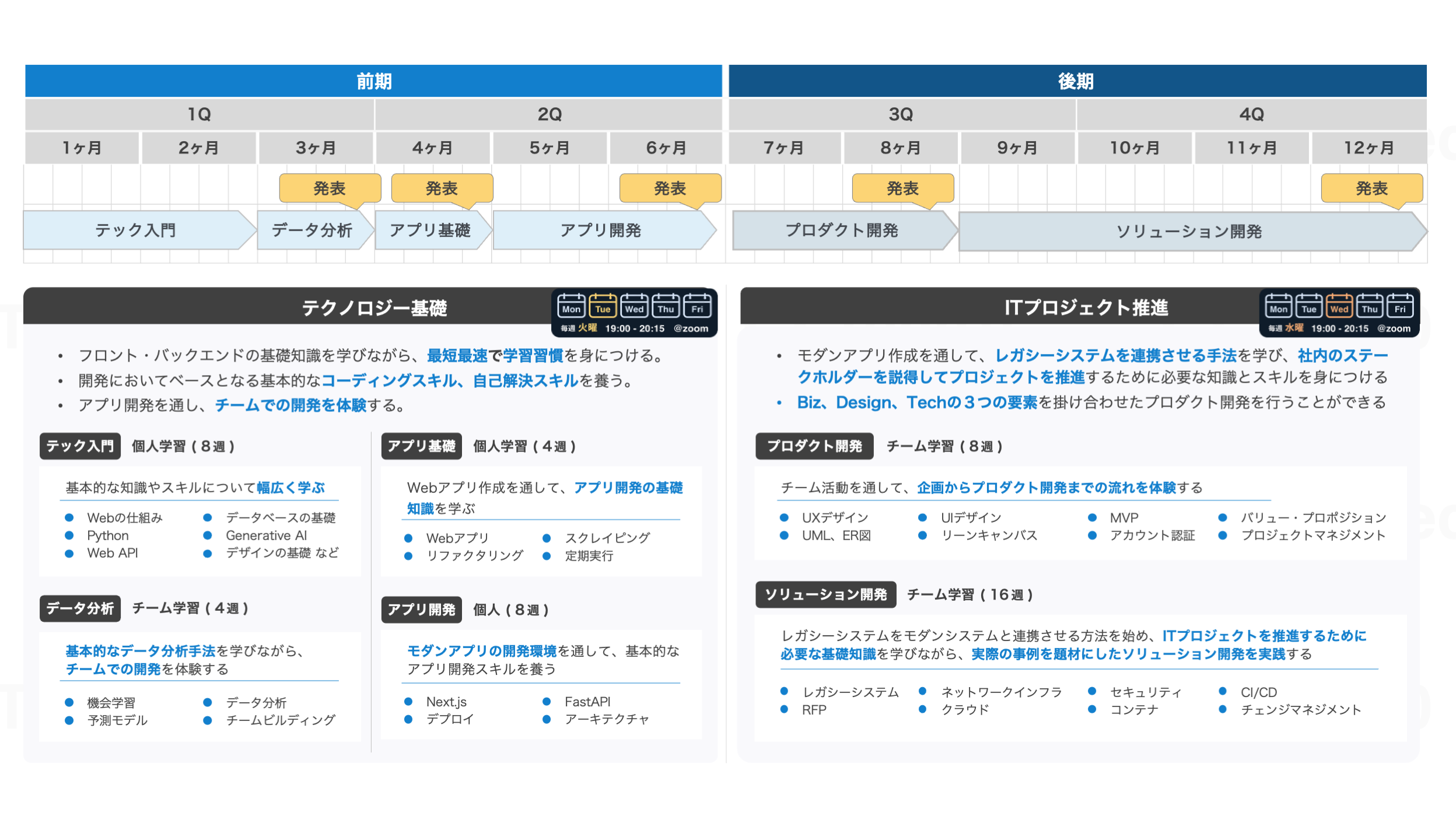 毎週なるべく講義やグループワーク等へ参加頂くのが、エンジニアとしてのスキルを向上させる上でベストですが、都合がつかない際は欠席頂いても問題ございません。